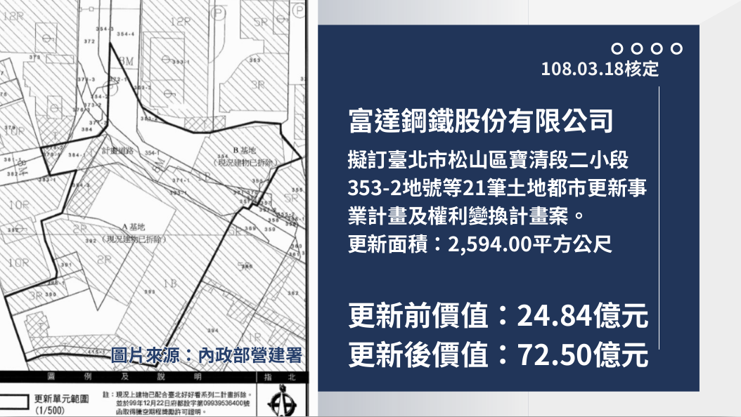 台灣銀行古蹟容積移轉、遠雄建設、興富發建設、 麗達建設、茂德建設、士林開發(股)公司、四維精密材料(股)公司、台北市政府都市發展局、新北市政府都市發展局、臺中市政府都市發展局、嘉義市政府、高雄市政府都市發展局